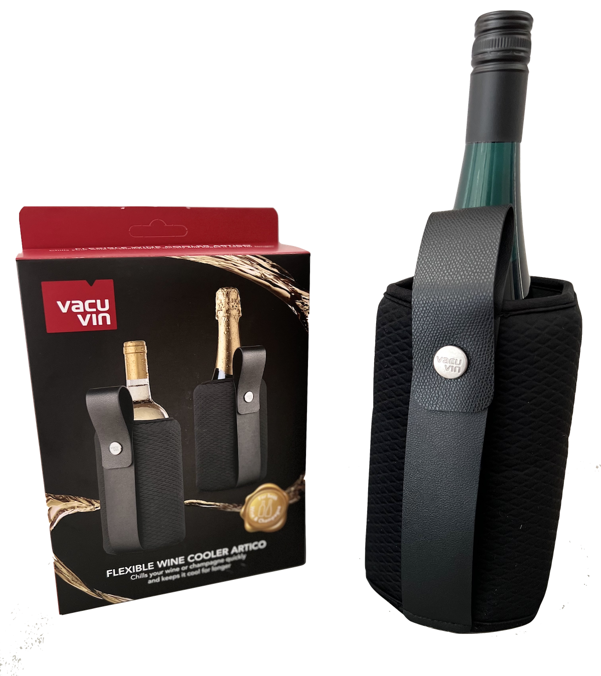 Nicht nur der Wein mit dem Etikett von Juliane Golbs ist ein Kunstwerk, sondern auch diese Weinkühlmanschette. Er kühlt die Weine sehr schnell und behält dies auch lange bei. Dazu nicht im herkömmlichen langweiligen Design. Einfach den Vacu Vin Weinkühler für 6 Stunden in den Gefrierschrank legen und den ganzen Abend kühlen Wein genießen.
